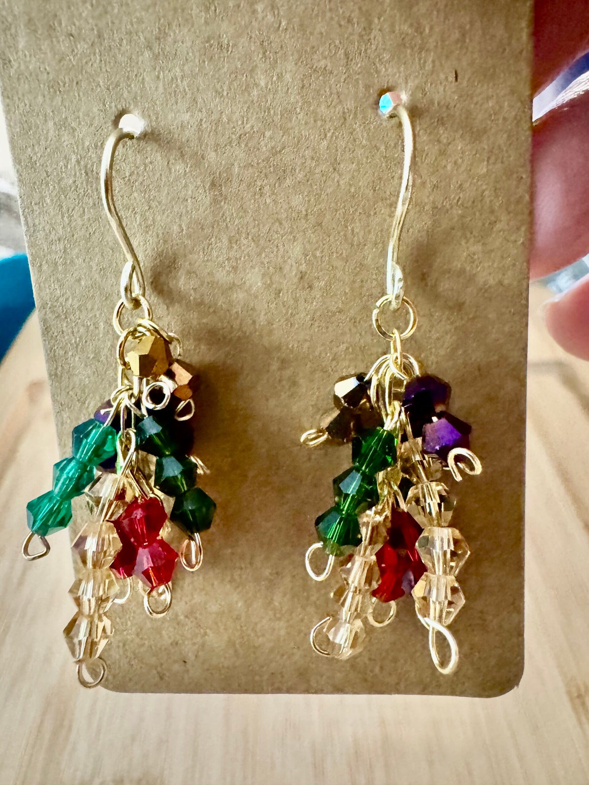 Colored glass beads hanging from a gold chain that give a fun dangling appeal. So fun.