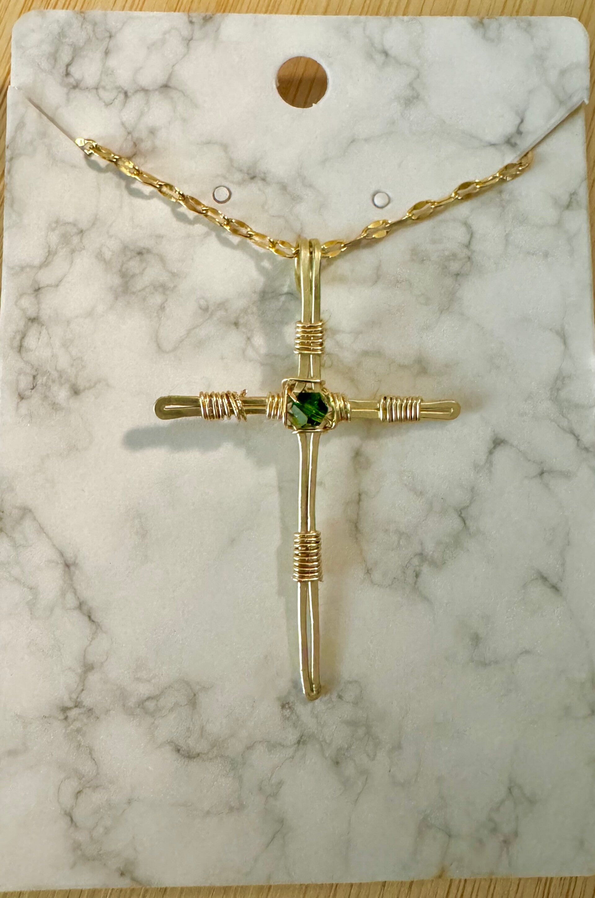 Gold handmade metal cross with a green glass bead in the center. This is a eye catching piece. Non tarnish metal.
