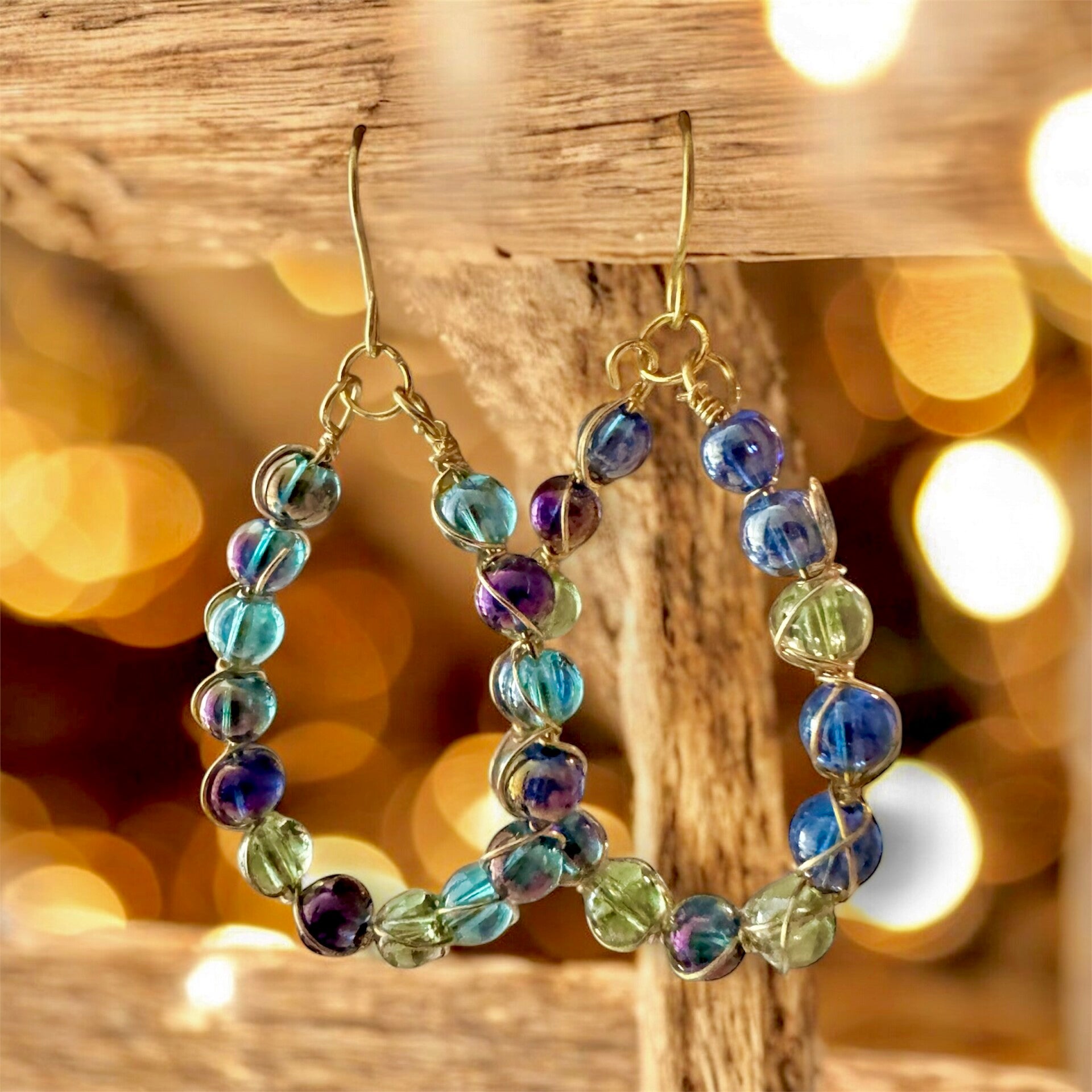 Glass beads loop around to create a beautiful drop earring. Gorgeous beautiful beads set in gold wire.